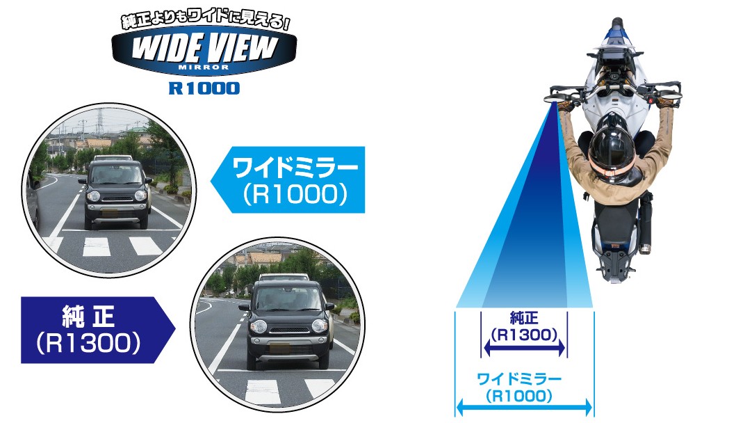 φ118mm大型ミラーは横幅が広くとても一目で後方確認ができます。 - 純正より広く見えるR1000鏡