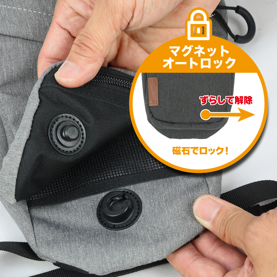 切り欠き方向にスライドしてロック解除、半自動で閉まるマグネットバックル採用で開け閉めは片手でOK