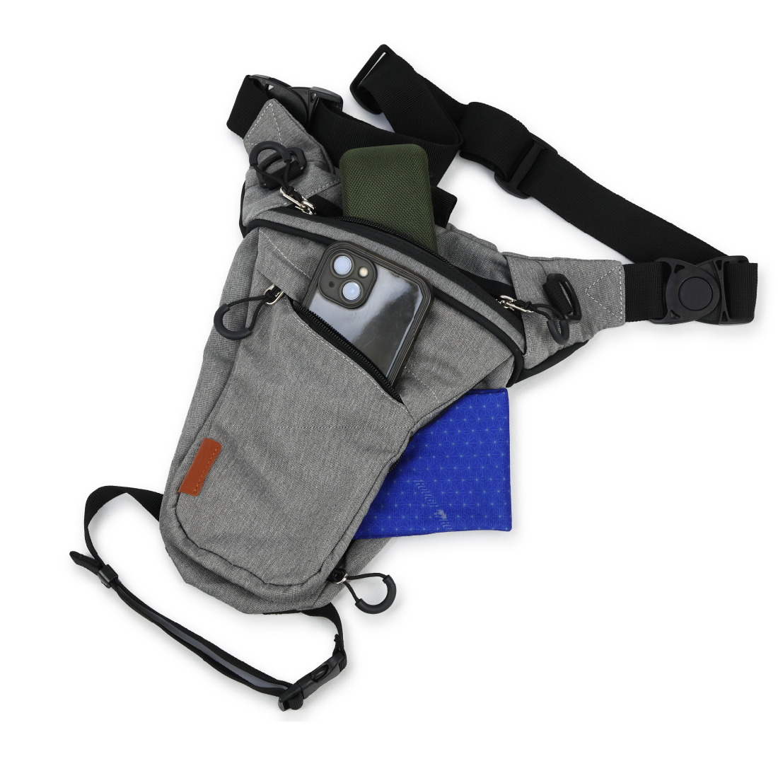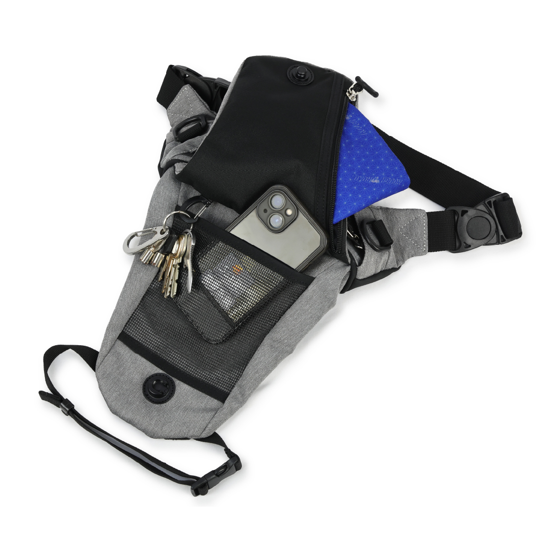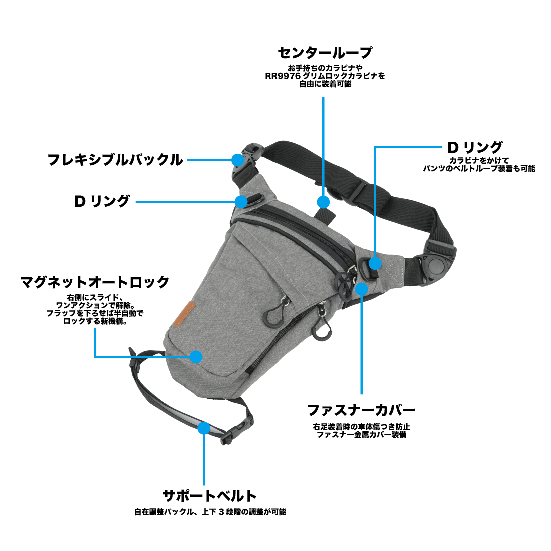 メッシュポケットやキーフック、長財布対応のメインスペースはそのままに、片手で開け閉めできるマグネットオートロックシステムを採用し、サポートベルトは自由度を高める仕様へ改良。さらに多様な使い方に対応したい声にお答えして、パンツのベルトループにカラビナ掛けでも使用できるようDリングを増設、各所ベルトは取り外し可能にしました。左右どちらでも装着可能な両端フレキシブルバックル仕様です。