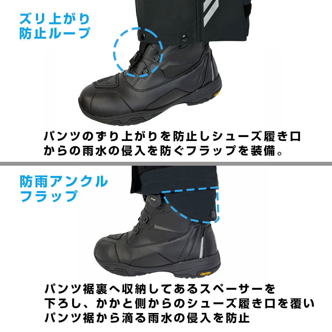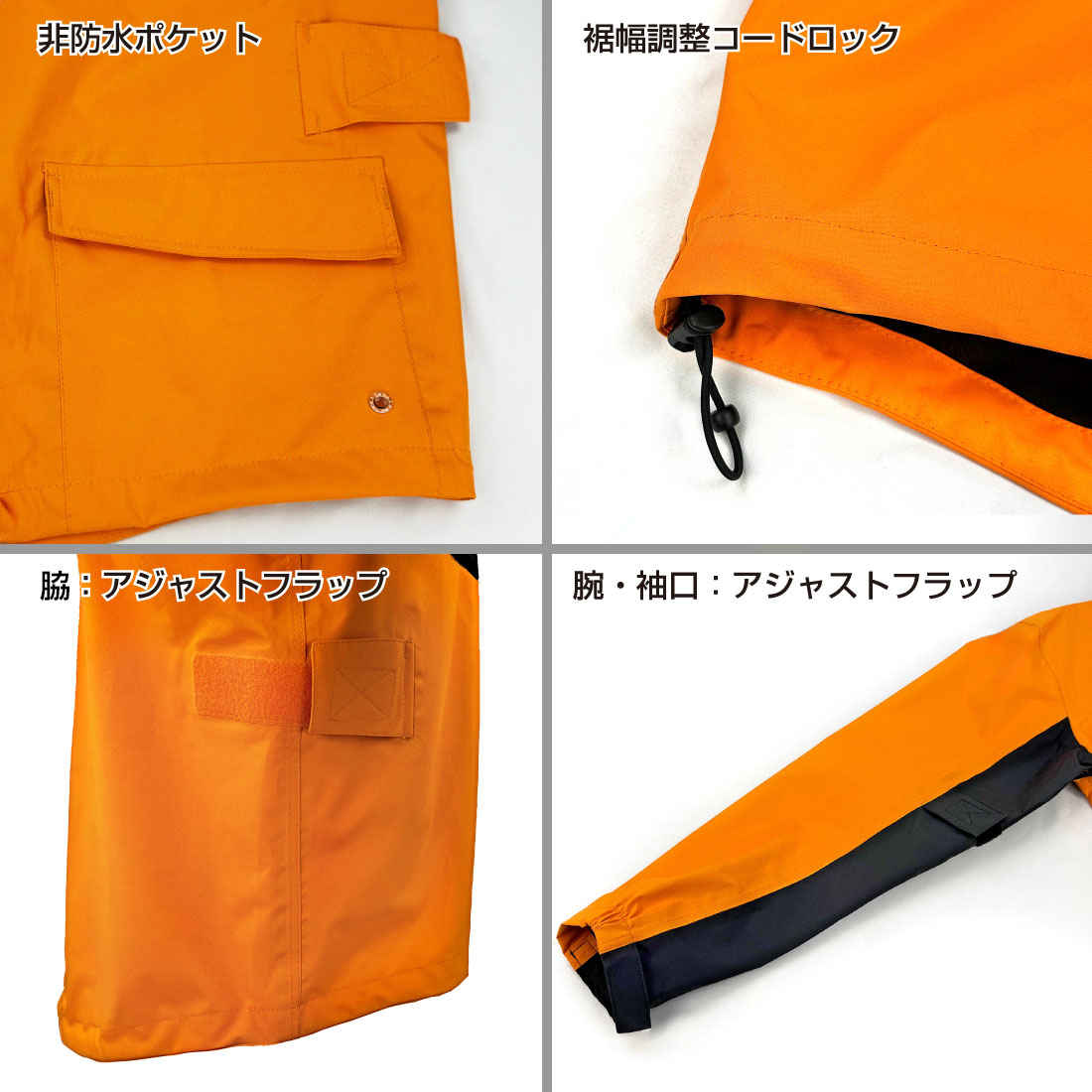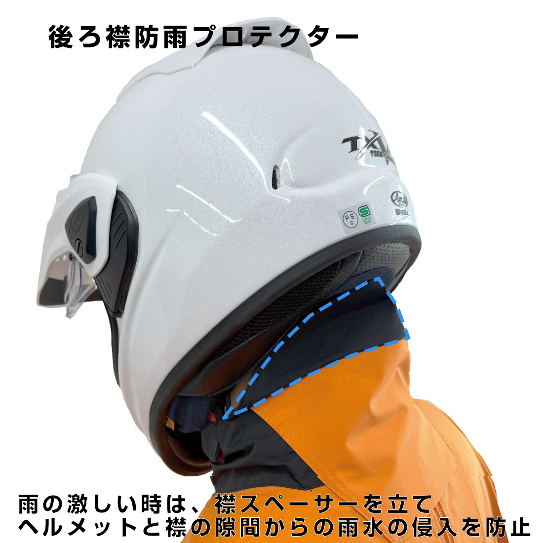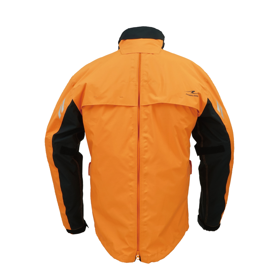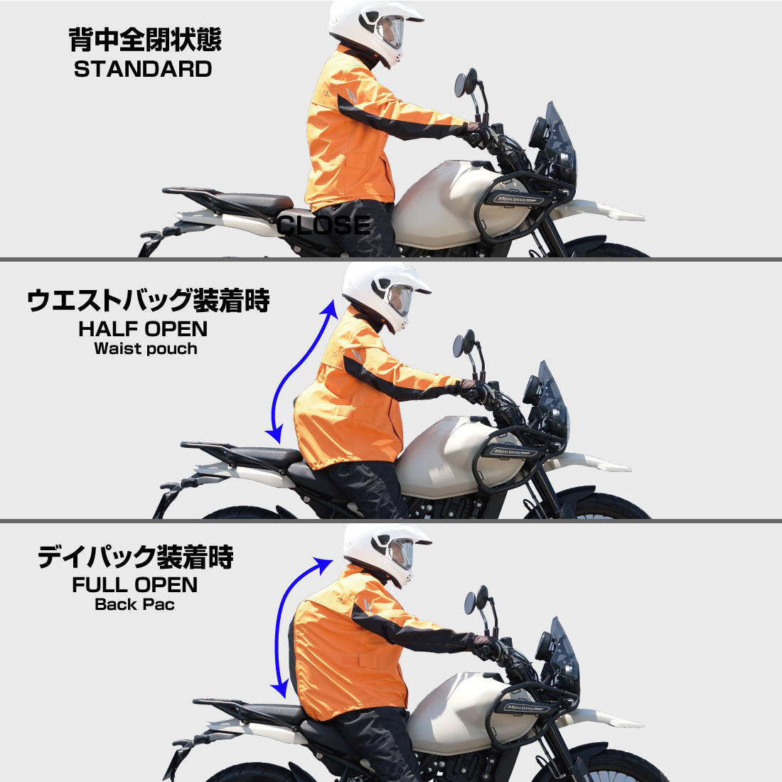 背中に配されたファスナーをオープンすることでデイパックやウエストバッグを装着したまま着用できるため荷物の心配をせずにライディングに集中出来ます。メイン素材はストレッチ性のある表地に、防水透湿層、裏地ニットをラミネートし3レイヤー構造とすることで適度なストレッチ性と耐久性を両立。パンツは股部分の縫製を無くし耐久性を上げ、バイクにまたがるときに突っ張りずらいデルタカッティングを採用。カラーは雨の日に被視認性もよく湿った気分を明るくしてくれるオレンジとプラチナシルバーを、幅広いサイズラインナップで設定。カラダだけでなく大事な荷物を雨から守る雨の日も楽しむライダーのためのツーリングに最適な本格派レインスーツです。