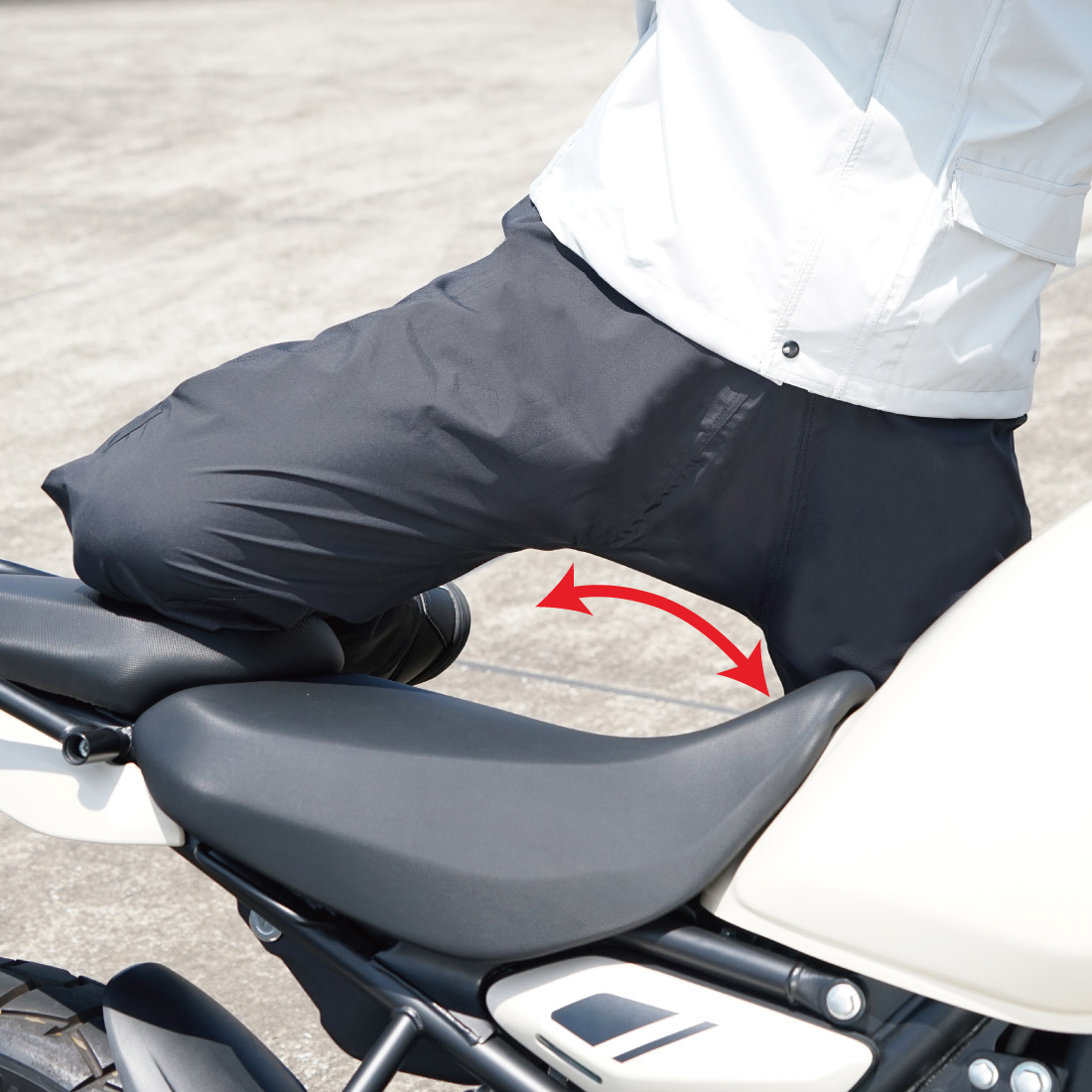 表生地+デュアルテックスフィルム(防風・防水・透湿素材)+30Dニットをラミネートした三層構造の高性能素材。 走行時の雨水の侵入を防ぎ、湿気を外へ放出するためウェア内をドライに保ち快適です。 ウェアに裏地を装備する必要が無いため軽量・シンプルで耐久性を求められるウェアに適しています。