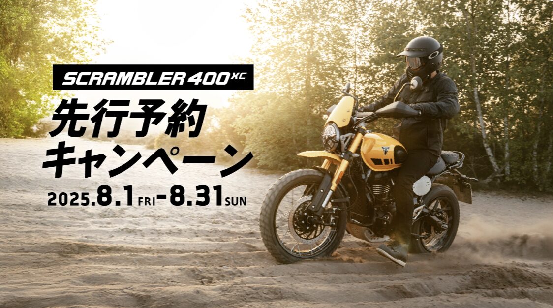 トライアンフモーターサイクルズジャパン株式会社は、400ccモデル「SCRAMBLER 400 XC」のデビューを記念し、2025年8月1日から31日まで「SCRAMBLER 400 XC 先行予約キャンペーン」を実施している。