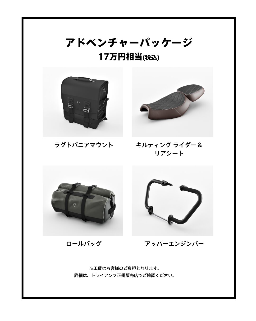 対象車種:SCRAMBLER 400 XC トライアンフ公式サイトの「注文に関する問い合わせ」にて、先行予約(お見積り依頼)をしていただいた方の中から、抽選で5名様に日本限定のアクセサリーセット「アドベンチャーパッケージ」をプレゼント。