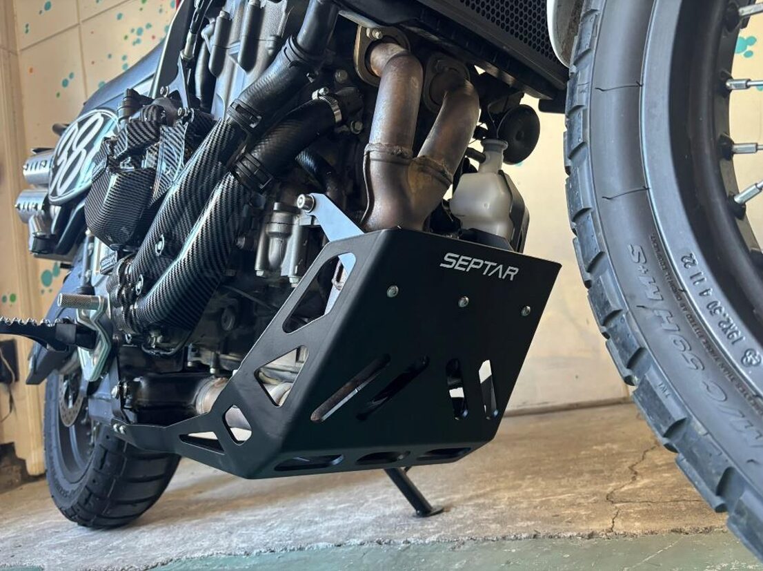 キャバレロ700専用に開発されたアルミ製アンダーガード。エンジンの主要部分をカバー、オフロードライディングを安心にこなせる逸品だ。