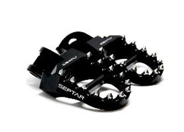 ラリーにも使える大型フットペグセット。鋭い爪ががっちり靴底に食い込み、走りを安定させる。4段階のステップ位置の調整も可能な仕様としている。