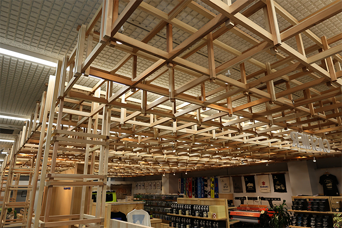 店舗内装は、スズキの祖業である織機の木組みから着想を得た温かみのあるデザインを採用、木材は地元浜松産の天竜材を活用し、天竜スギを木組みやパーテーションなどに、天竜ヒノキを陳列棚に使用しています。また、歴史館入口から受付までの天井部や天吊りライトのシェードに遠州織、現存する鈴木式織機で織られたソファの張地などに使用するなど、浜松やスズキにゆかりのある素材を随所に活用しています。