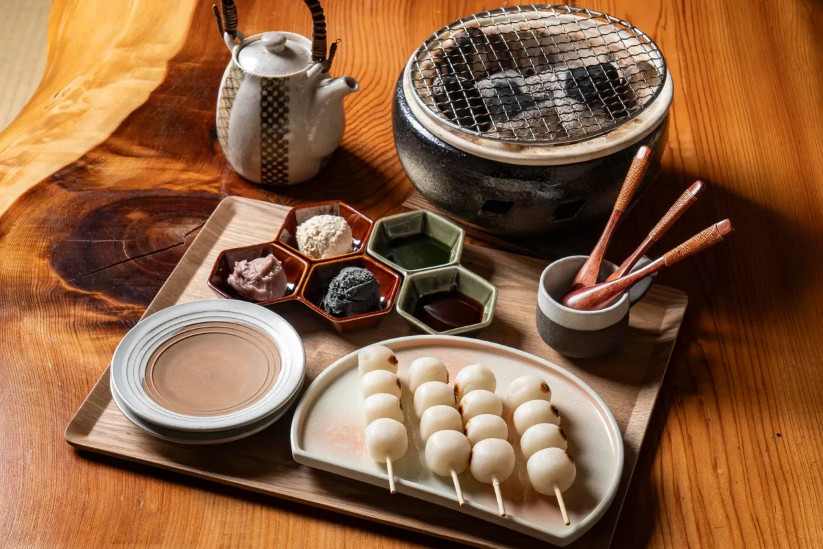 食後の甘味には、七輪で自ら焼きながら楽しめる「焼きお団子セット」が提供される。温かいお茶とともに、香ばしいお団子を味わいながら、古民家のゆったりとした雰囲気の中で過ごす時間は、特別な体験となる。