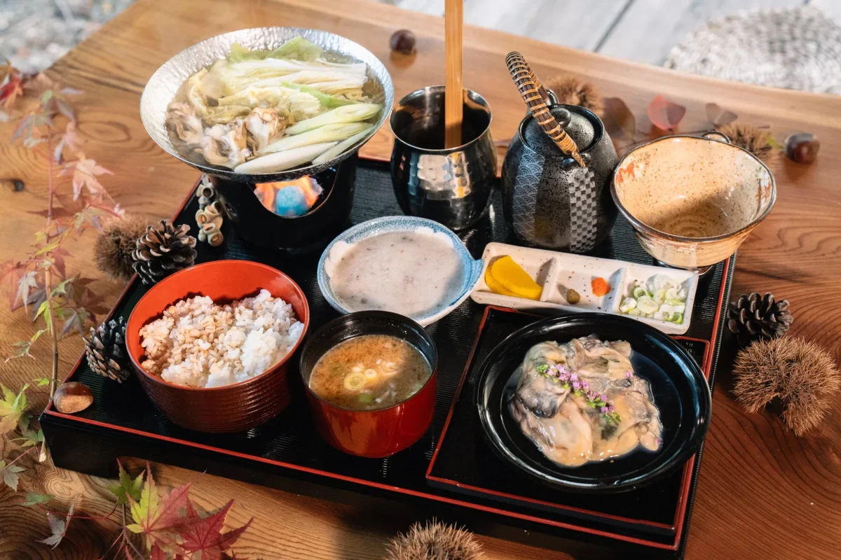 「牡蠣しゃぶ御膳」は、冬の海の恵みを存分に味わえる一品である。旬を迎える宮城県産の生牡蠣を、たっぷりの冬野菜とともにしゃぶしゃぶで提供する。牡蠣は濃厚な旨味とぷりぷりとした食感が特徴とされており、その本来の美味しさが引き出される。自然薯とろろ、麦飯、味噌汁、小鉢がセットになっており、食べ応えと栄養バランスを両立している。冷えが気になる利用者にも推奨される滋養豊富なメニューである。