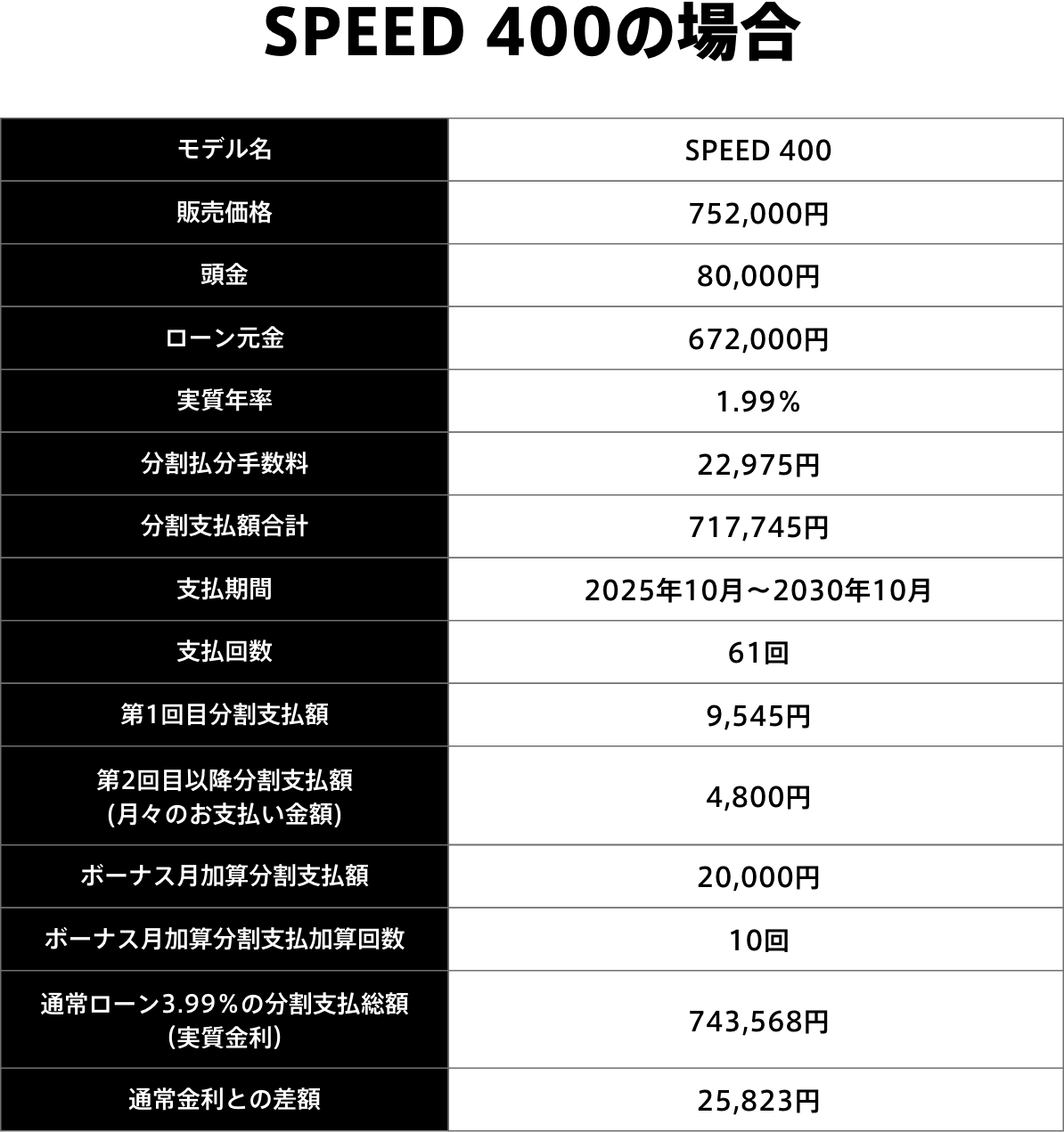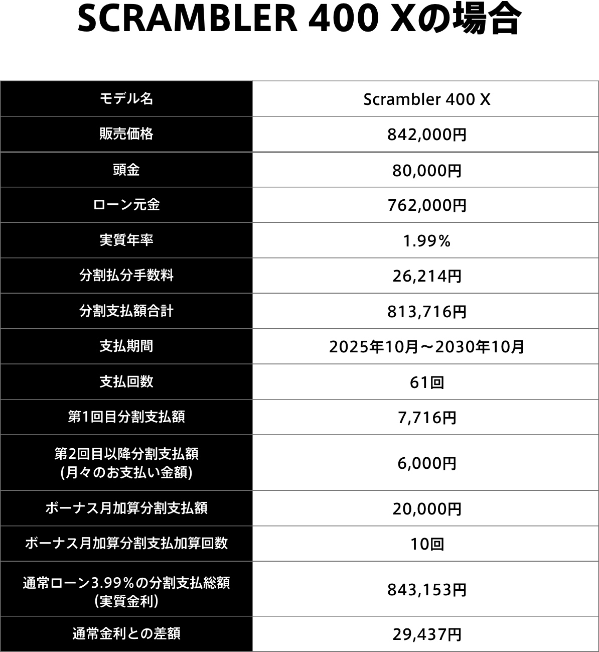 例:61回払い、頭金8万円、ボーナス加算2万円で算出※シミュレーションの金利、お支払金額は参考例です。詳しくは各販売店までお問い合わせください。 ※価格はメーカー希望小売価格で参考価格です。登録時には、上記金額の他に税金、保険料等の諸経費が必要となります。トライアンフライダーファイナンスは株式会社ジャックスが引受、運営しております。