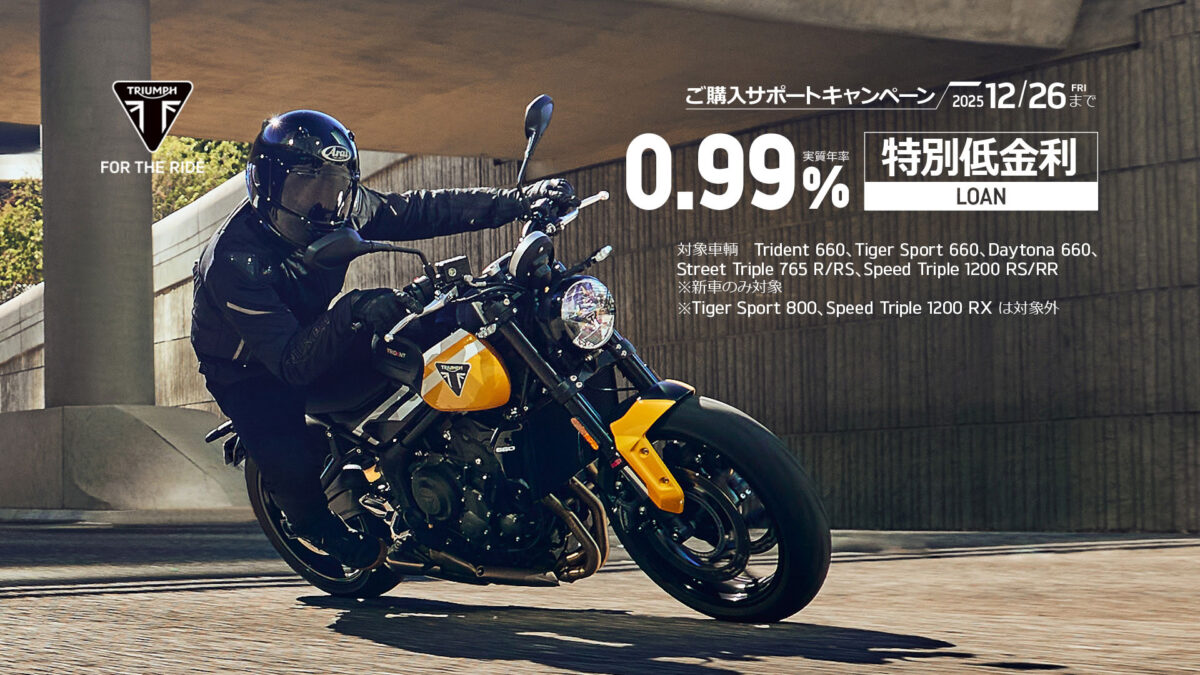トライアンフモーターサイクルズジャパン株式会社(本社:東京都港区海岸 代表取締役社長:大貫陽介)は〜12月26日までの期間中、全国のトライアンフ正規販売店にて「ご購入サポートキャンペーンが開催中である事をお伝えします。