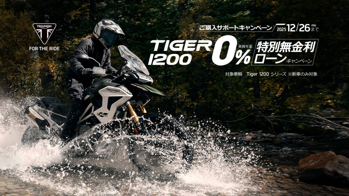 内容:キャンペーン期間中、全国のトライアンフ正規販売店にてTiger 1200をご成約、且つローン契約を完了していただいたお客様に、「0% 特別無金利ローン」をご提供します。