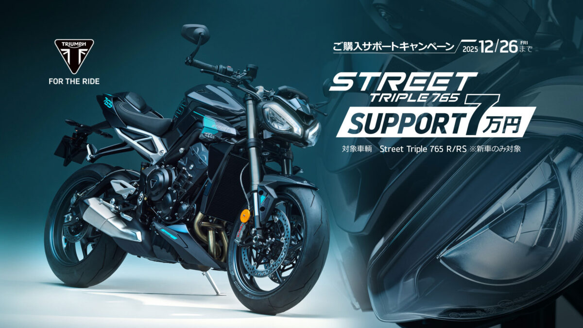 内容:キャンペーン期間中、全国のトライアンフ正規販売店にてStreet Triple 765 RS/Rをご成約・ご登録された方に、7万円分の特別購入サポートをいたします。