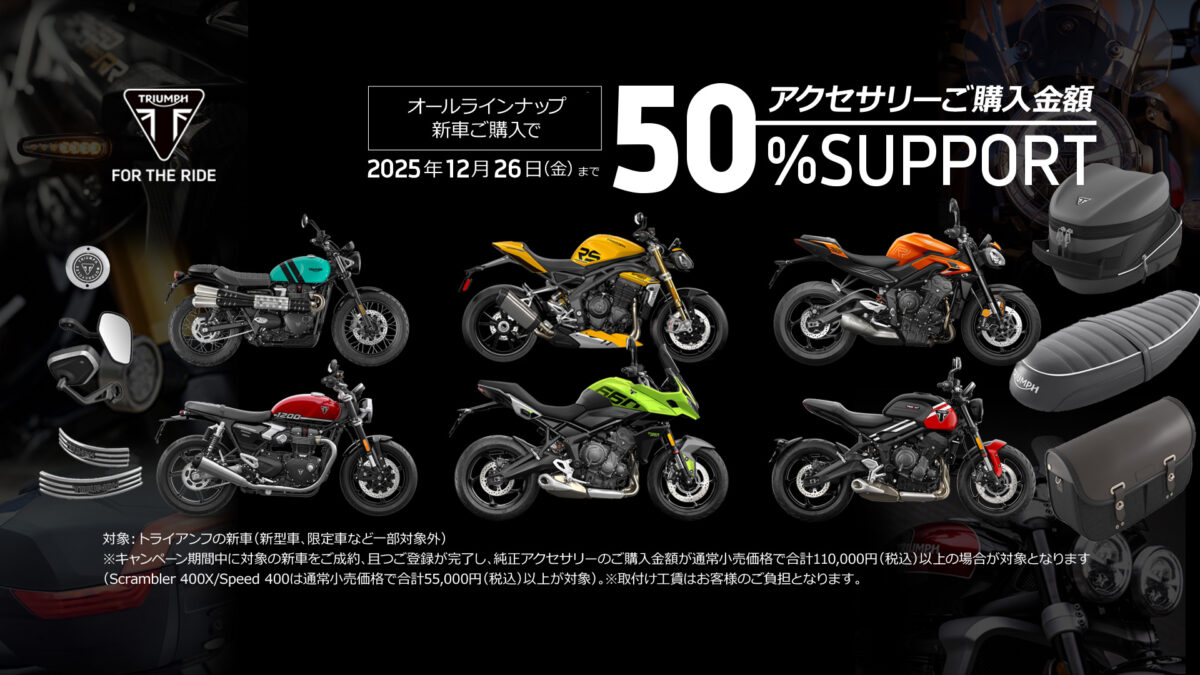 トライアンフモーターサイクルズジャパン株式会社は、2025年12月26日までの期間限定で「秋のご購入サポートキャンペーン」を開催している。