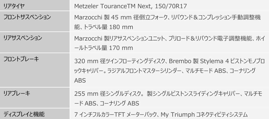 - 「Tiger 1200」特別仕様車には、ブラインドスポット アシスト および レーンチェンジ アシスト を搭載し、さらにライダーとパッセンジャーの両方に対応するヒーテッドシートも標準装備しています。