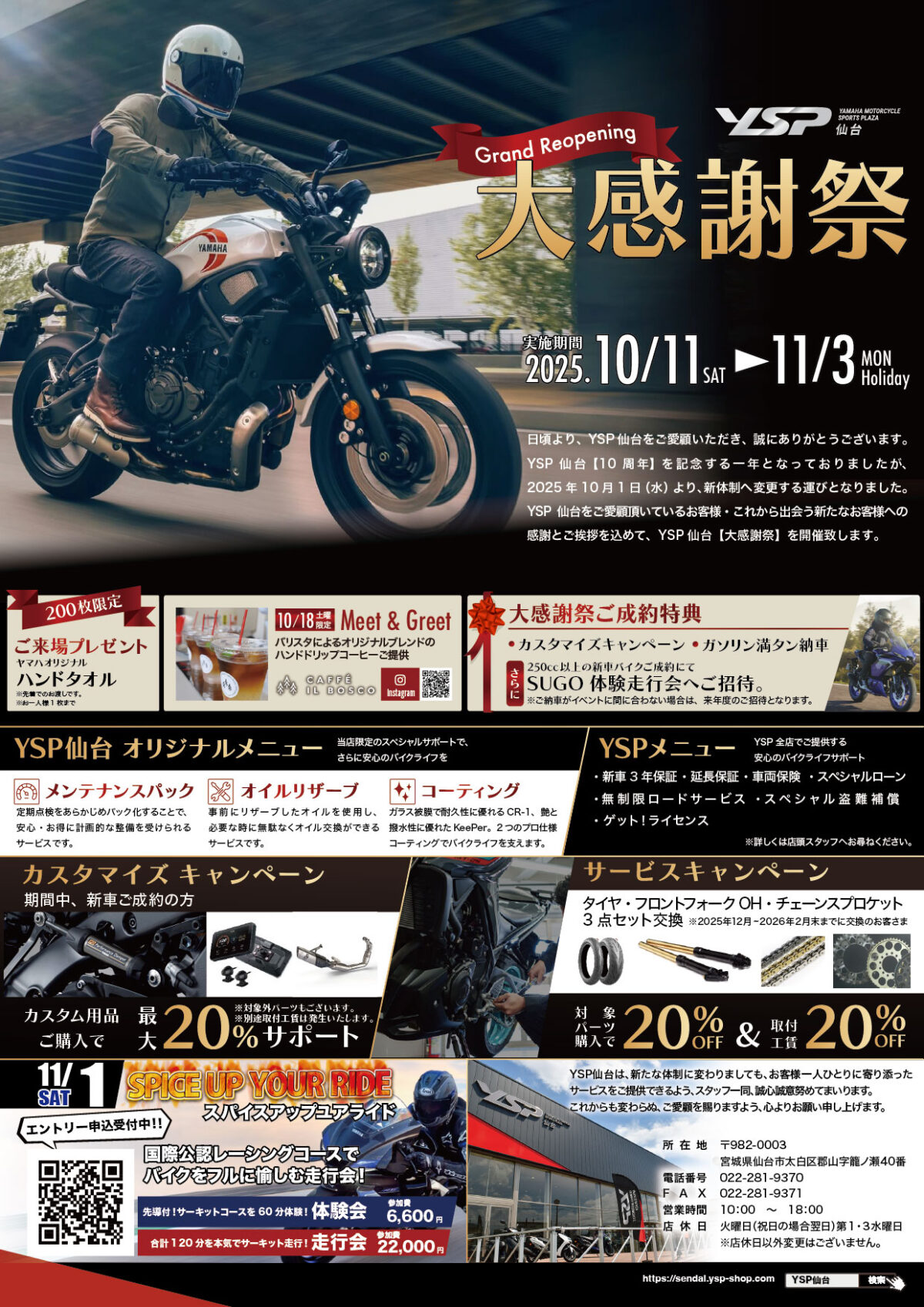YSP仙台は、今回のリオープンを機に、従来からの信頼と実績をさらに強化し、地域に根ざした店舗として一層のサービス向上を目指してまいります。ヤマハ バイクの販売や整備はもちろん、イベントや試乗会を通じて「乗る楽しさ」「所有する喜び」を発信し、ライダーコミュニティの中心となることを目指します。これからも「買う前も、買う時も、買った後も」安心して任せていただけるヤマハ専門店として、東北・宮城エリアのお客様に安心安全で豊かなライディングライフをお届けして参ります。