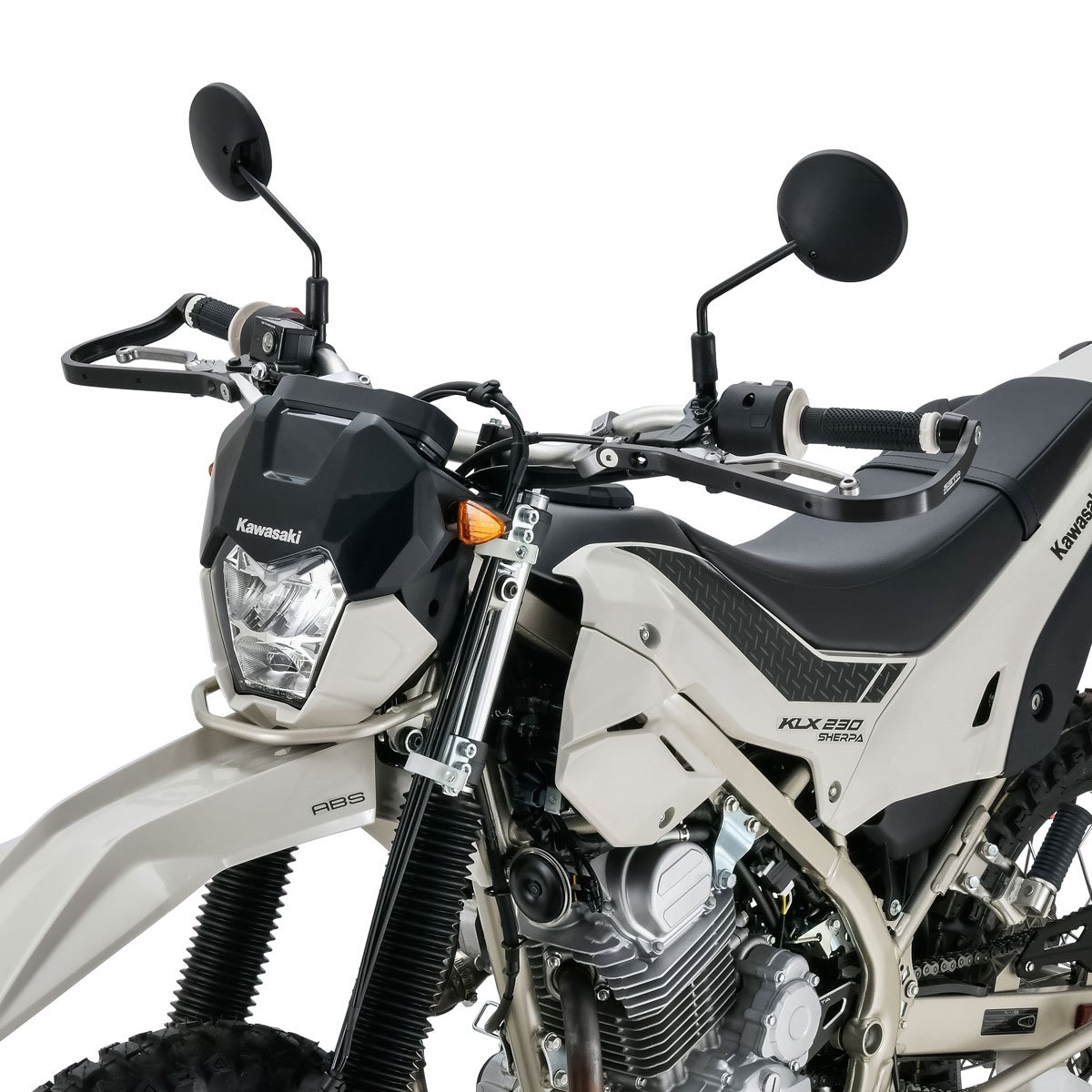 KLX230シェルパ用に専用設計されたアルミニウムハンドガード。オフロード走行にも耐えうる高強度アルミニウム合金を採用。