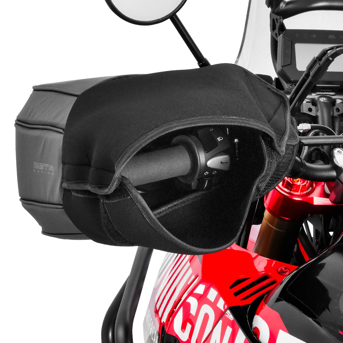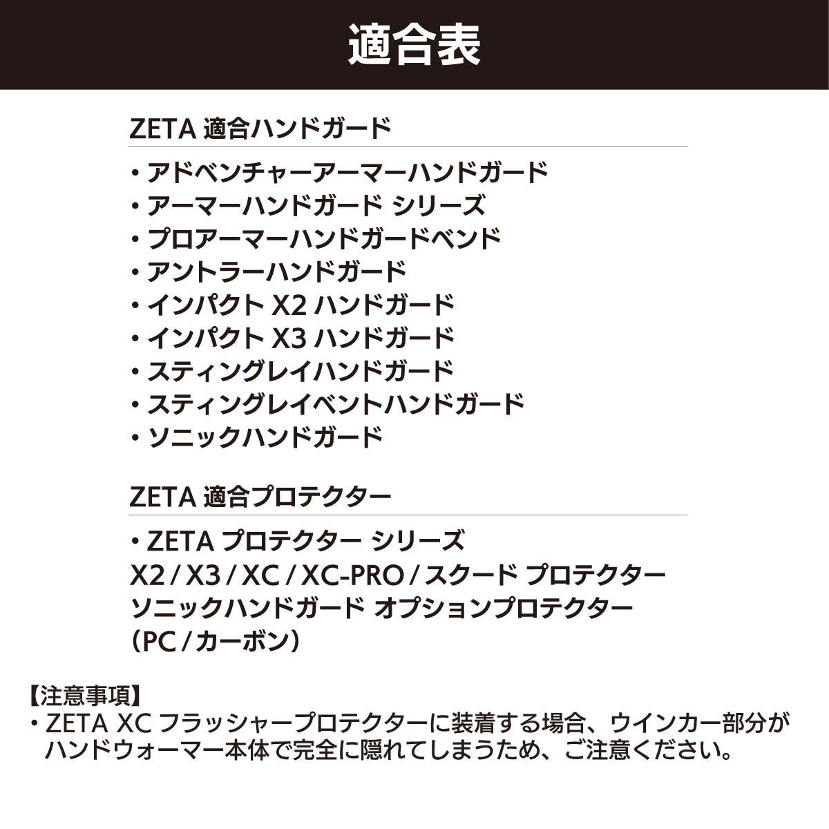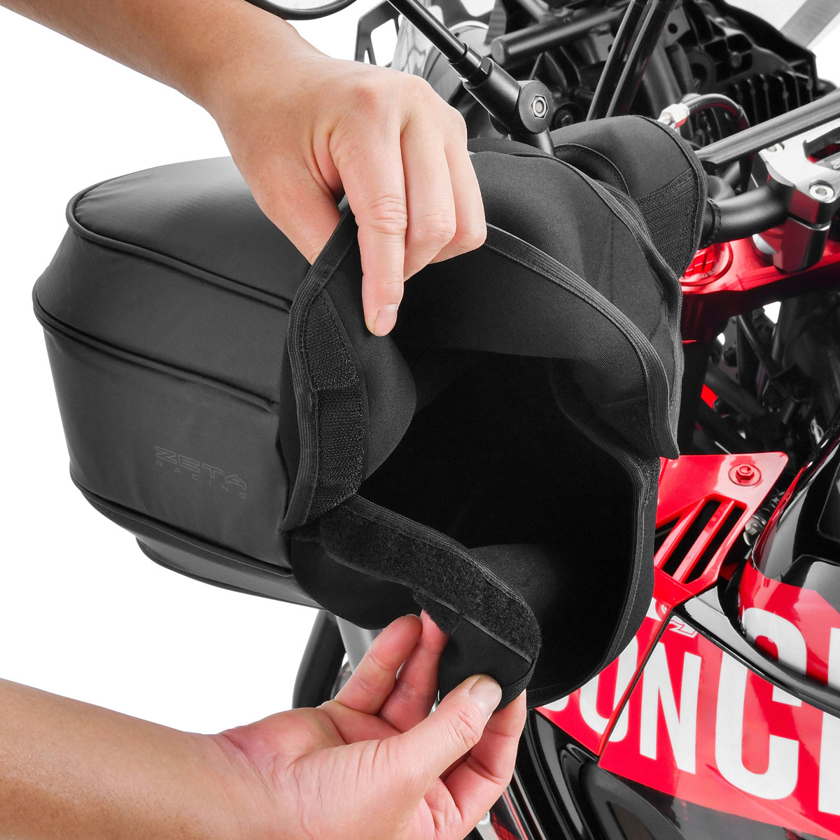 • 本製品はZETAハンドガードに専用設計されたハンドウォーマーです。純正ハンドガードや社外製品に関しては、ハンドガードの大きさや形状によっては取付けができない場合がございます。ハンドウォーマーのサイズをご確認の上、ご検討ください。