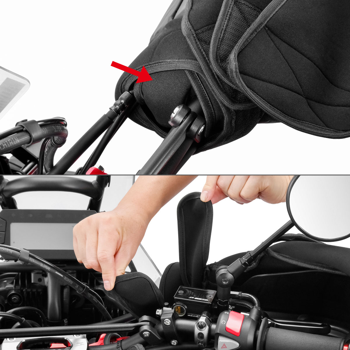 手首開口部を広く調節することで操作性が向上し、ライディングの妨げにならない。不意の転倒時でもハンドウォーマーから手を抜きやすく、安全に走行が可能。