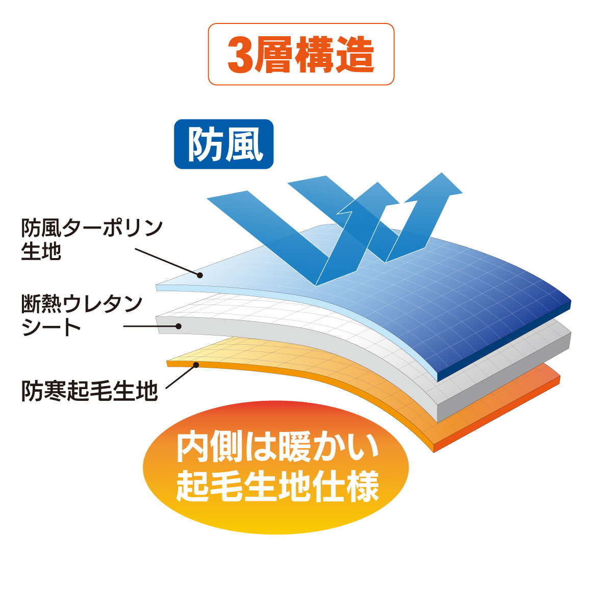 PVCターポリン・ウレタンシート・起毛生地を使用した3層構造によって「防風」「防寒」「保温」を実現。冬の冷たい走行風から手の冷えを防ぐ。