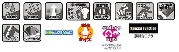 PROTECTOR: 肩・肘・背中パッド 標準装備 (胸パッドはオプション)