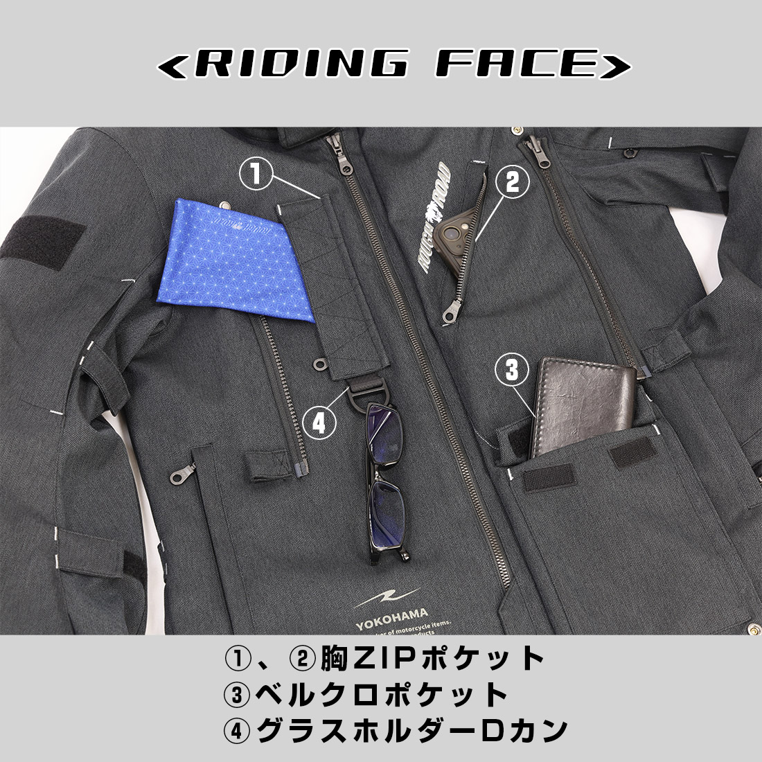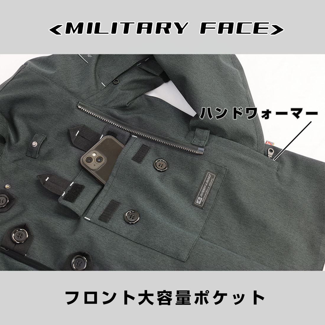 3種類のポケットが出現するライディングフェイスは、ミリタリーフェイスとは打って変わり実用性と通気性にシフトするラフアンドロードならではの機能を豊富に揃えました。ポケットはもちろん、グラスホルダーやオリジナル機能のフロントVベントを備え、腕・背中のファスナーベンチレーションと併用することで日中は気温が上がる日も快適に走り続けられます。