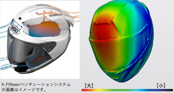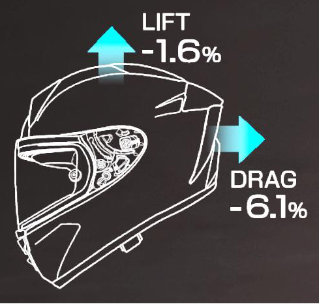 X-Fifteenは従来モデルと比較し、ヘルメットが上方へ浮き上がろうとするLift が1.6%、前方から押し付けられるDragが6.1%低減。(いずれも自社大型風洞設備での参考数値)