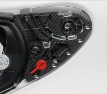 チークパッドはヘルメット被り口側にくる下端部分の独自形状により、走行時にリフトを抑え、また、頬にあたる面積が従来モデル比116%と拡大したことで高速走行時でもぶれにくいホールド感を実現。