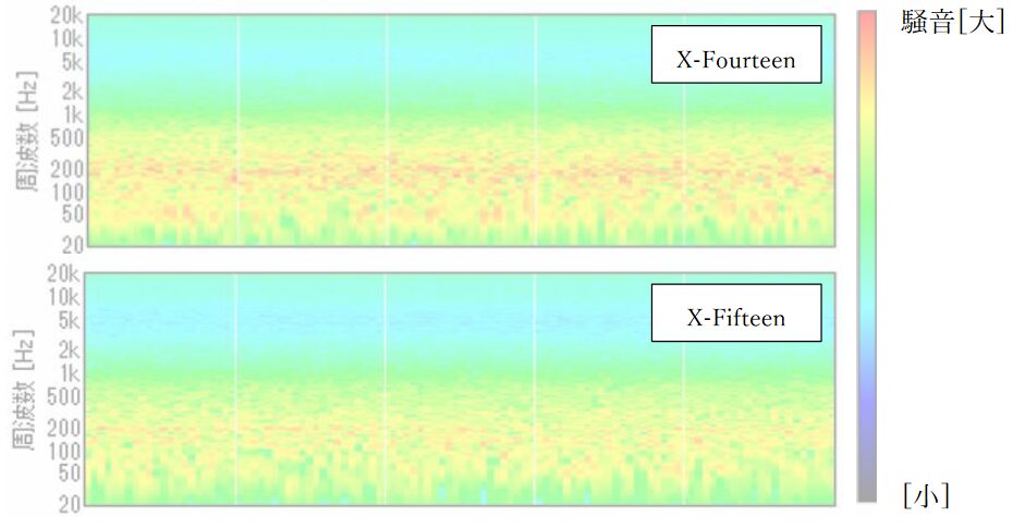 100km/h相当の環境における風切り音を比較。X-Fifteenは従来モデルに比べ、特に低い音域の騒音が小さいことが分かる。