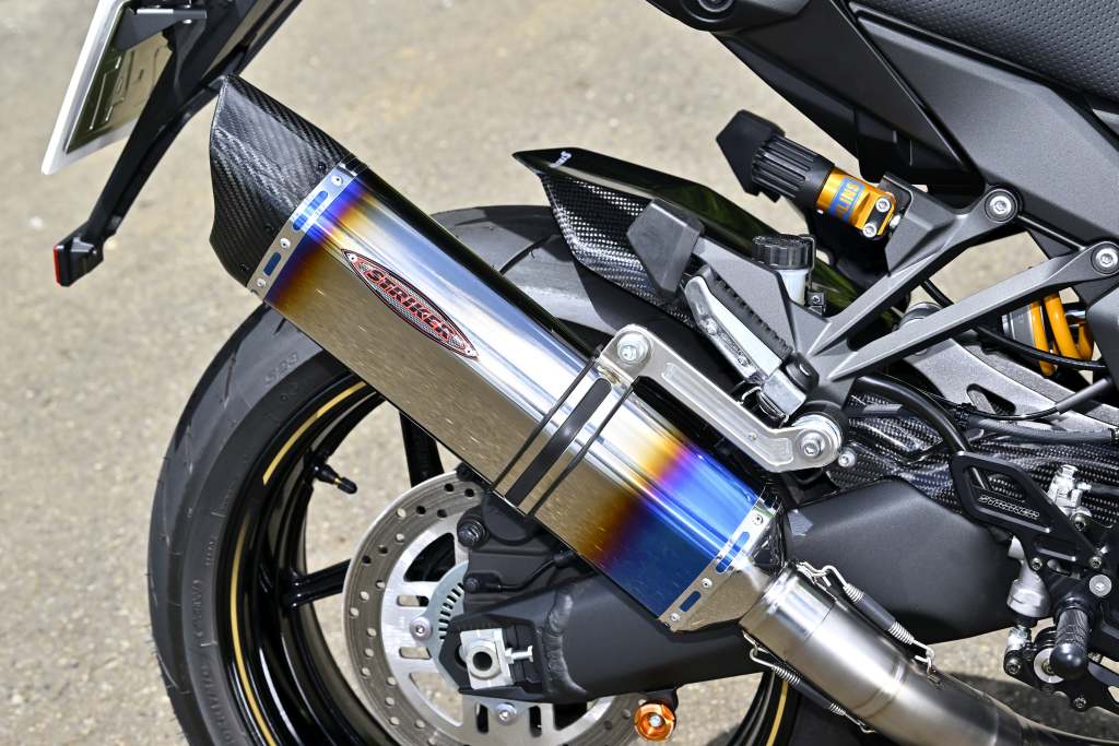 マフラー総重量は驚異の約4.8kg、ノーマル比で約60%の軽量化を実現。 運動性能も大幅アップし、より軽快なバイクになり、乗る事を更に楽しくさせるSTRIKER渾身のフルエキゾーストです。