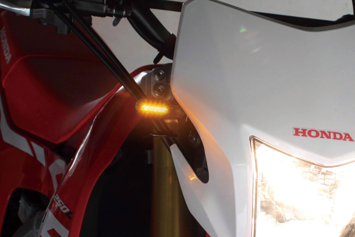 車両専用キットは、ストリームラインミニLEDウインカー(4個)にワイドレンジフラッシャーリレー(1個)、フロント用ブラケット(2個)、リア用ブラケット(2個)、
