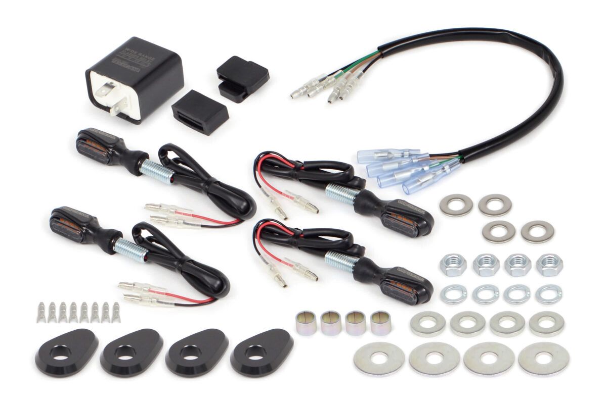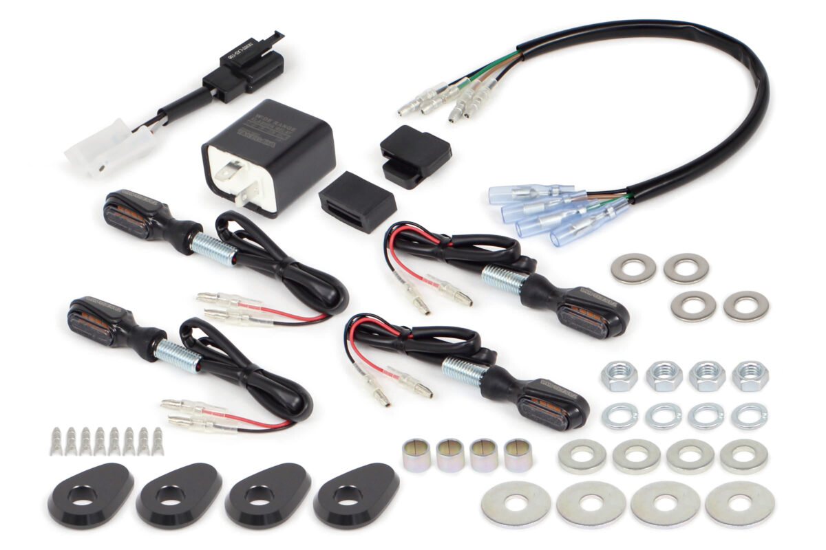 車両専用キットは、ストリームラインミニLEDウインカー(4個)にワイドレンジフラッシャーリレー(1個)、ハーネスCOMP.(1個)、ブラケット(4個)、スペーサー(4個)、プレーンワッシャー(厚み2.6mm×4個)、オスギボシ(8個)が付属しています。