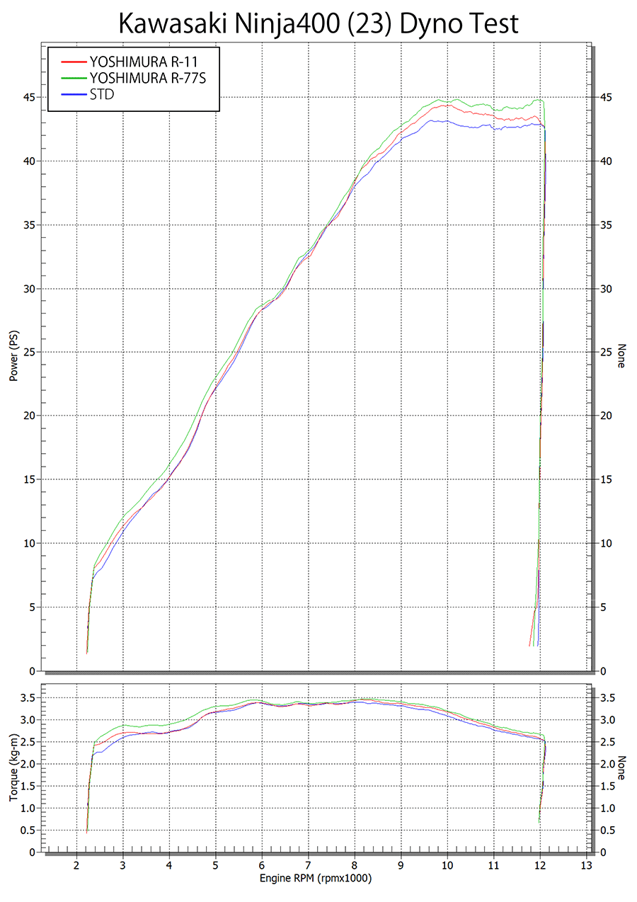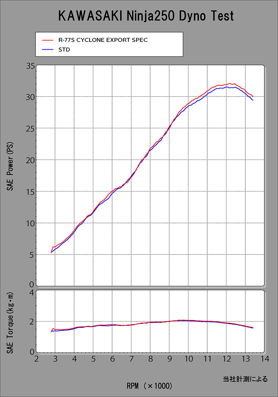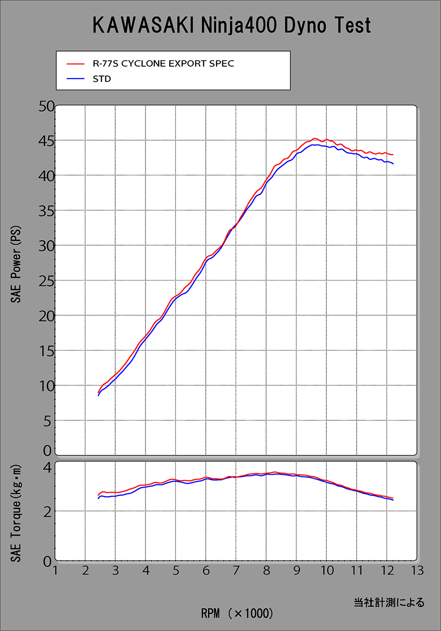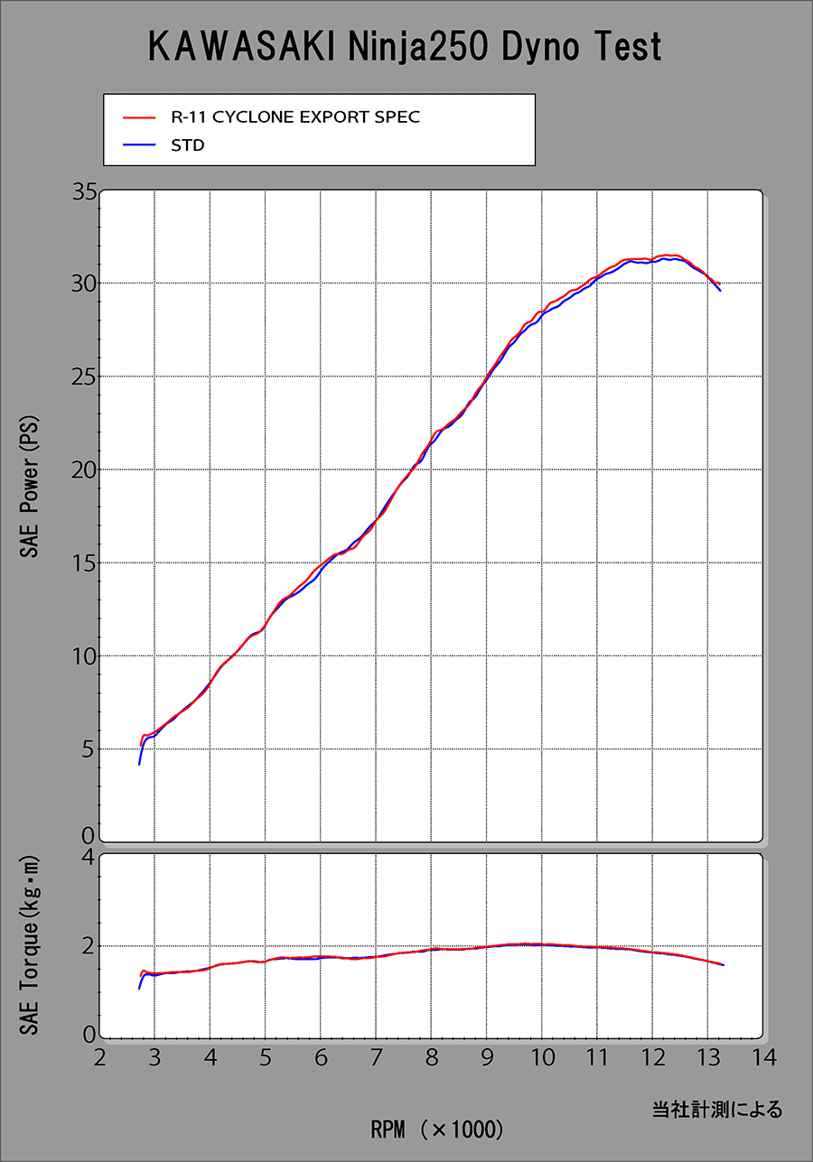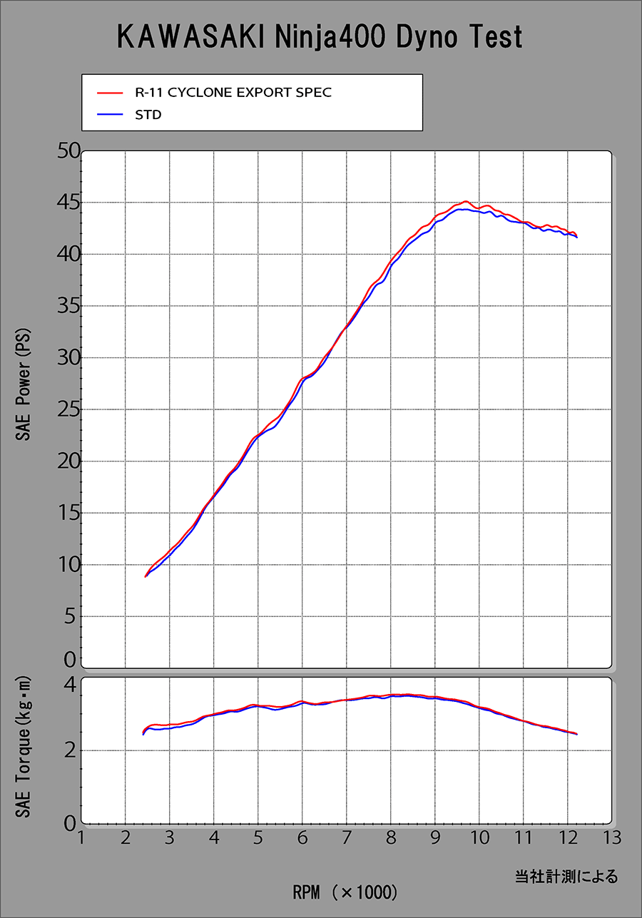扱い易さと出力UPの両立を求め開発されたNinja250/400用サイクロンは、ほぼ全域においてSTDの性能を上回り、7,500rpmからピークにかけては、よりパフォーマンスを向上させます。他のサイレンサーと比べコンパクトにまとめられたR-11で軽量化・音量抑制・高音質・性能UPを達成し、重量はSTDサイレンサーと比較し、Ninja250で43%、Ninja400で49%の軽量化を実現(※)