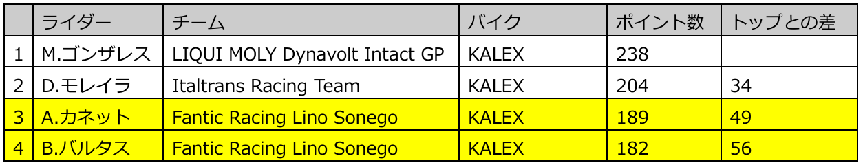 また、チームランキングにおいては、ファンティック・レーシング・リノ=ソネゴがトップを守っている。ランキング2番手のチームとの差は29ポイントである。