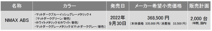 ヤマハ発動機株式会社は、原付二種スクーター「NMAX ABS」のカラーリングを変更し、2022年9月30日に発売する。新色は、マットダークグリーン、ホワイト、マットダークグレーの3色。価格は368,500円(税込)となる。