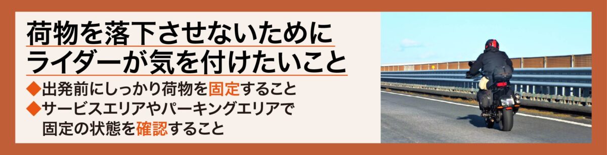 落下物を発生させないためには、固定具を過信せず、ライダー自身がこまめに荷物の固定などを気にかけることが重要です。
