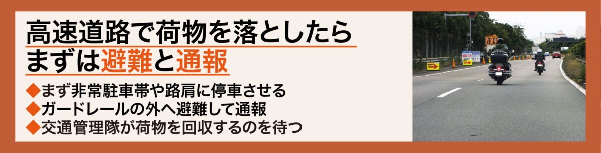 なお、通報の後、自力で落下した荷物を回収しようとすると、後続車との事故につながる恐れがあるため、絶対にしてはいけません。