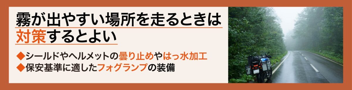 シールドの撥水処理、フォグランプの動作確認、そして何より「霧が出たら無理をしない」という意識が、安全なツーリングのためには必要です。