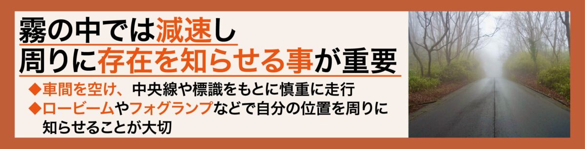 このほか、霧の中では道路のラインや標識が見えづらくなるため、センターラインやガードレール、路肩の白線を頼りに、より慎重に走行する必要があります。