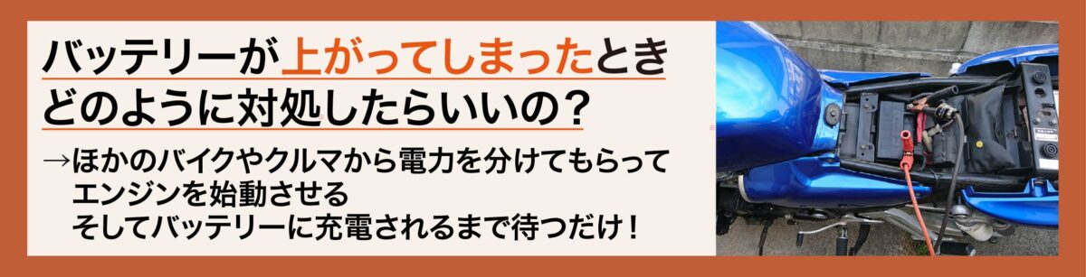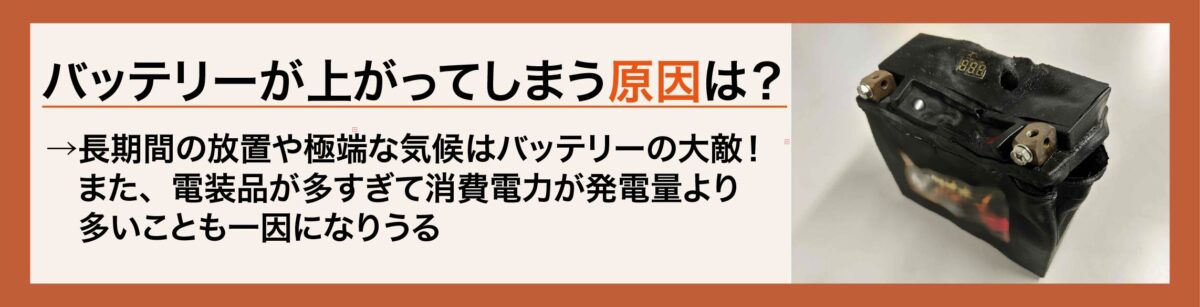 また、長期間バイクに乗らないことも、バッテリー上がりにつながります。