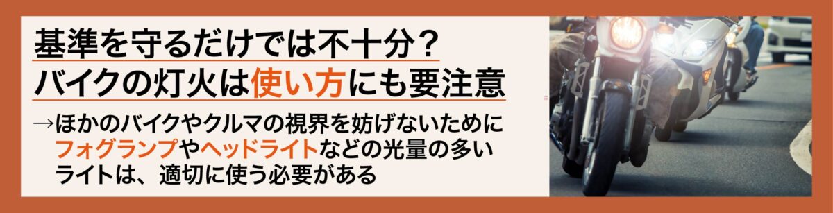 以上より、必要な明るさを満たしつつ、他のバイクへの配慮も忘れない設計と調整が不可欠といえます。