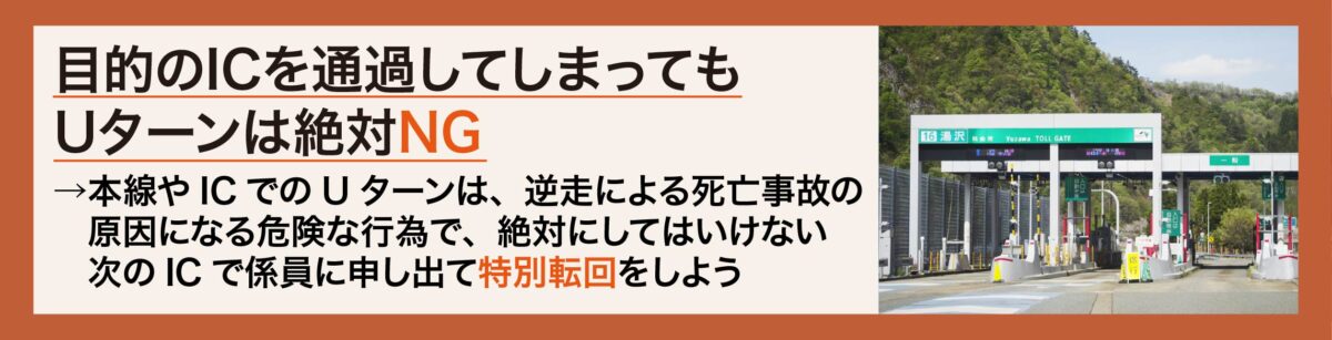 ただし、だからと言ってその場で転回しようとしたり、元のICに戻ろうとするような行為は避けなければなりません。
