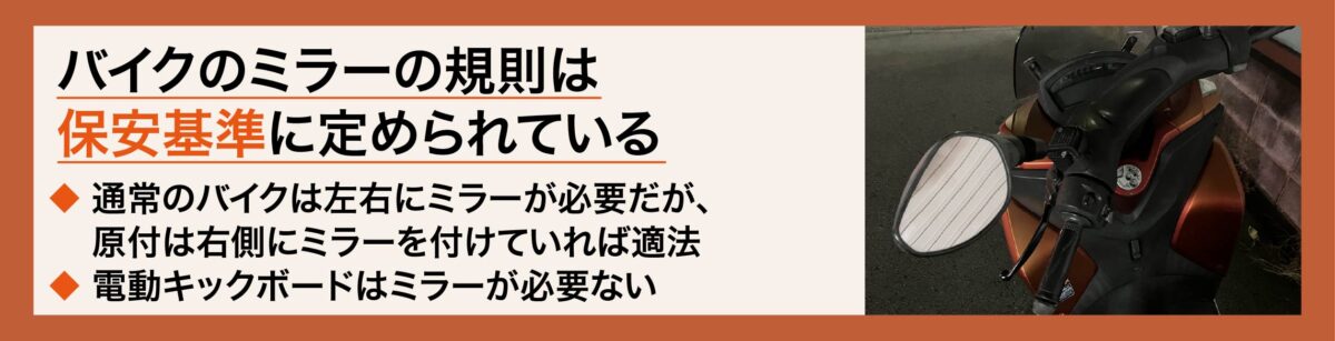 このように、多くのバイクはミラーを両側につける必要がある一方で、原付一種は右側のみで問題ないほか、電動キックボードにはそもそもミラーの装着義務がありません。