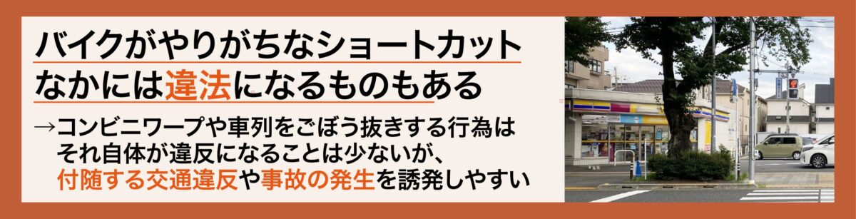 信号や渋滞を避けるために、バイクで交差点を回避しようとする行為のひとつに「コンビニワープ」があります。