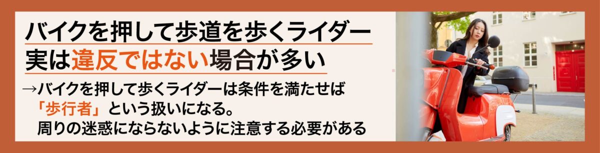 上述の通り、バイクを押して歩道を歩くライダーの行為は条件さえ満たせば合法といえます。