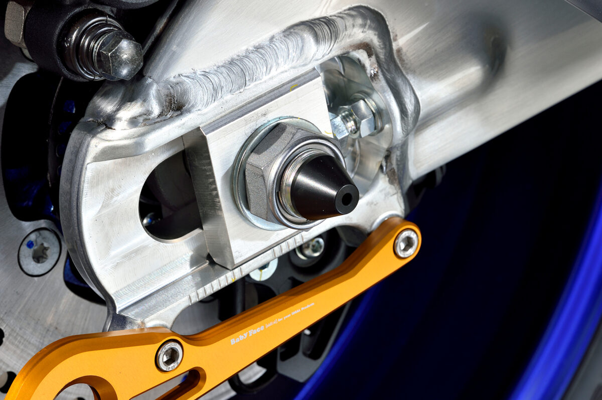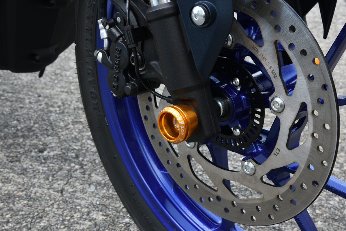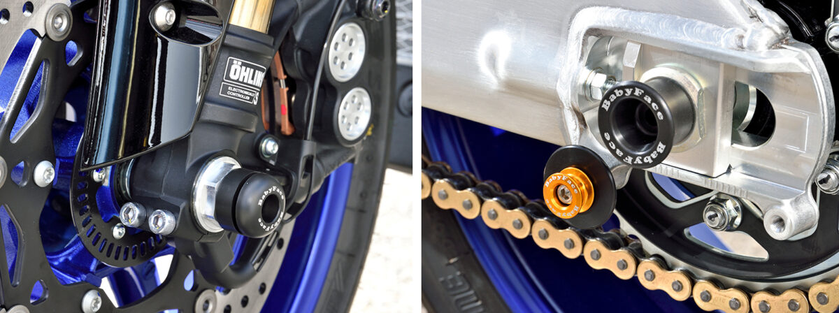 MT-25/3用プロテクションアイテムとして、ダメージを最小限に食い止める「フレームスライダー」/転倒時のアクスルシャフトの保護や足回りのドレスアップに最適な「アクスルカップ」を用意。