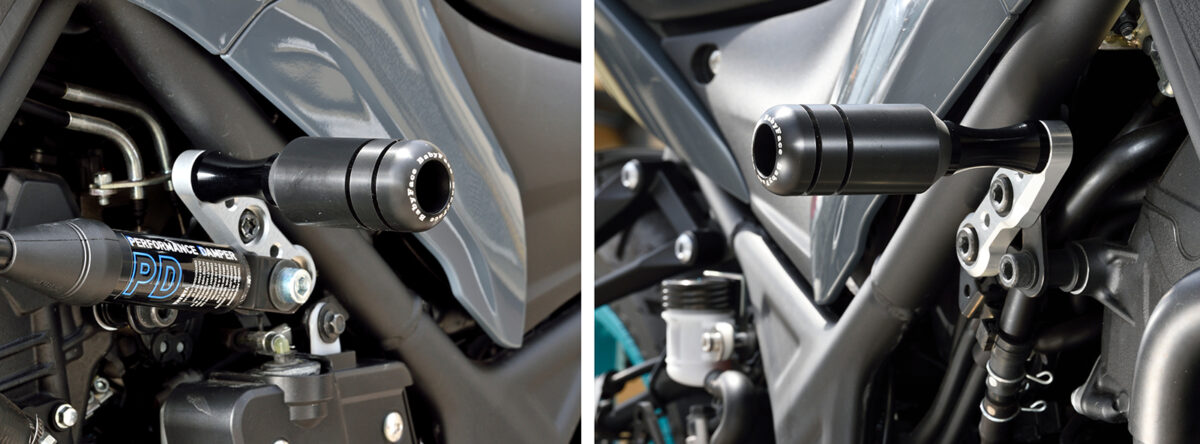 ・フレームスライダー:転倒時に地面と接触し、車体を滑らせることで衝撃をやわらげ車体フレームや外装の傷を軽減