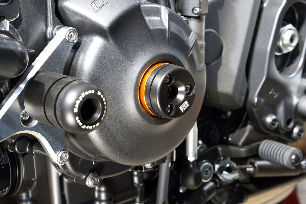 MT-09用プロテクションアイテムとして、万が一の転倒アクシデントからマシンダメージを軽減する2タイプの「フレームスライダー」/「エンジンスライダー」/クランクケースに装着しエンジンを保護する「タイミングホールプラグ」/前後のアクスルシャフトに装着しアクスルシャフト周辺を保護するジュラコン樹脂製「アクスルプロテクター」を用意。