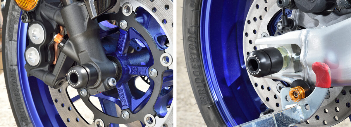 MT-10用プロテクションアイテムとして、万が一の転倒アクシデントからマシンダメージを軽減する2タイプの「フレームスライダー」/「エンジンスライダー」/前後のアクスルシャフトに装着しアクスルシャフト周辺を保護するジュラコン樹脂製「アクスルプロテクター」を用意。