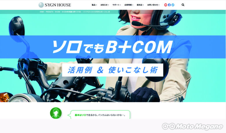 サインハウスのWEBサイト内でソロ走行が多い人向けの活用例や使いこなし術を紹介している。2種類のB+COMのどちらが自分にマッチするかもこのサイトで判断できる。