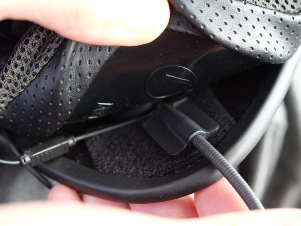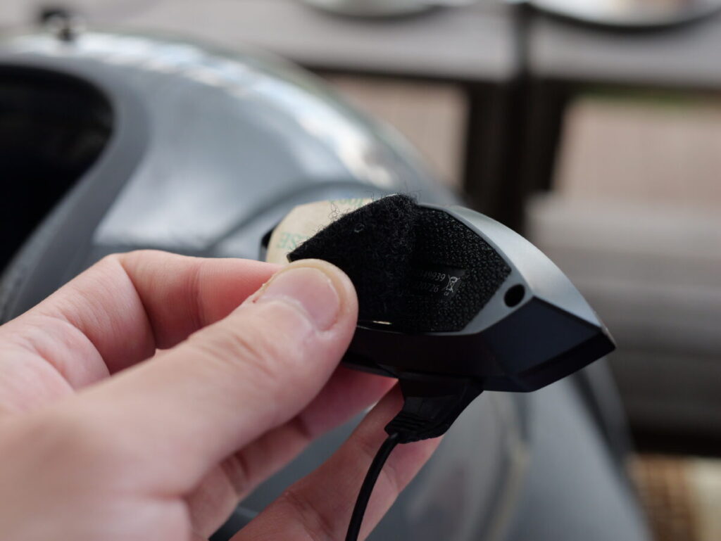 B+COM TALKは本体とヘルメットの固定が面ファスナーとなっており、アームマイクについてもチークパッド裏にアームマイク用の面ファスナーを取り付けて固定していく。本体とマイクの位置が決まったら、あとは本体とスピーカー、スピーカーから分岐するマイクの端子を繋ぎ、配線をインナー内側にしまい込むだけで作業はあっという間に完了してしまった。